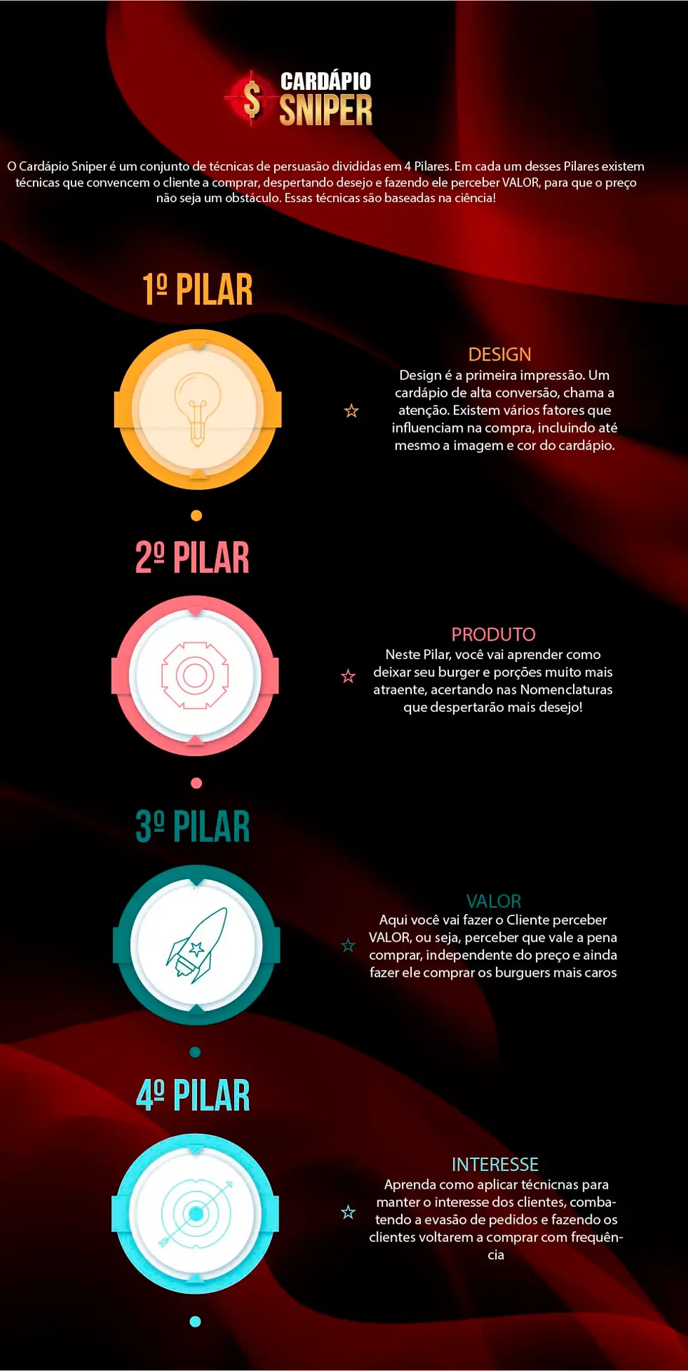 O “Cardápio Sniper” é um curso online com aulas gravadas, 100% focado em hamburgueria (tanto delivery, quanto loja fisica). Pode (e deve) ser aplicado em: cardápio digital, cardápio de whatsapp, iFood ou até mesmo seu cardápio fisico!